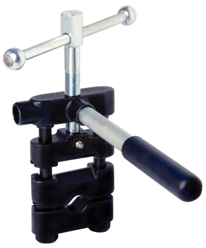 Copper shut-off tools are designed to shut off and reshape 3/4 In. to 2 In. type K copper tubing. The tool swings open to go around the pipe. Fine threads on the screw provide smooth, easy tightening. Sliding bar handle is used to increase leverage for turning and to permit work in tight places. Handle can be positioned in two different spots, depending on where there is clearance. The bottom open area of the shut-off tool is used to reground the tubing to allow 80-90% return of flow.
