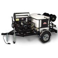 Designed for hot-water skids, Shark's TRS-3500 features a rugged, protective chassis design, 200-gallon water tank, leaf-spring suspension rated up to 3,300 pounds, and white-spoke wheels. Designed and pre-drilled for mounting the portable SSG/SSD skid hot-water pressure washer, this heavy duty single-axle trailer perfect for use on busy construction sites.