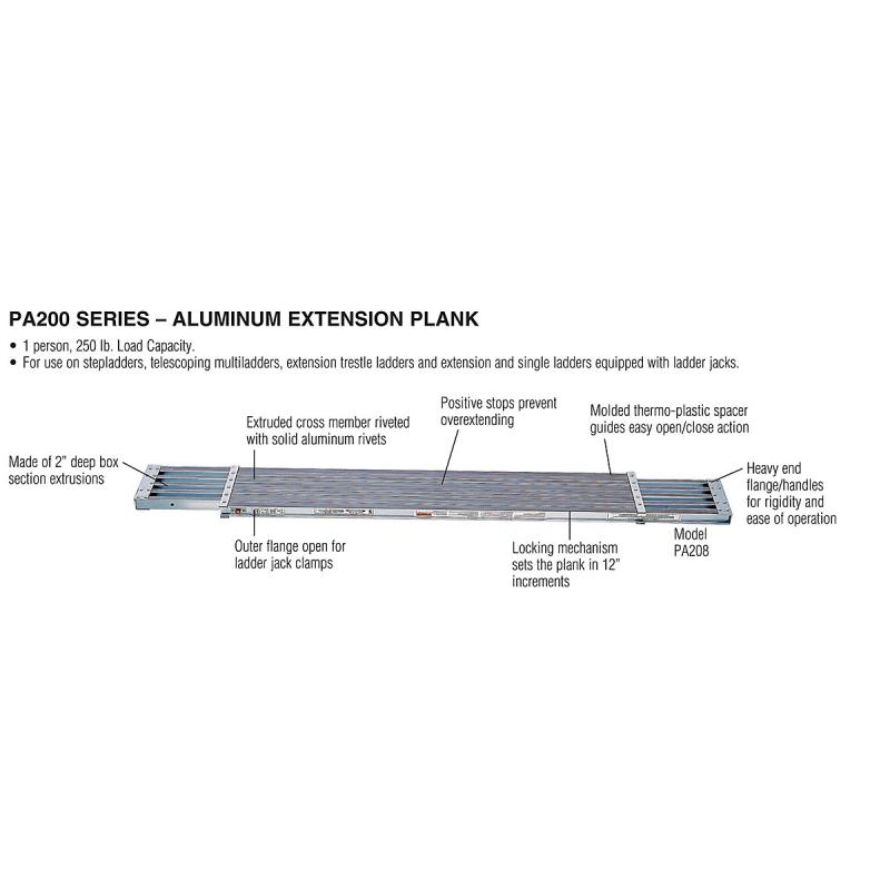 The PA200 series Aluminum Extension Planks are ideal for use on stepladders, telescoping multiladders, extension trestle ladders and extension and single straight ladders equipped with ladder jacks.
