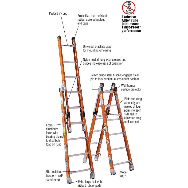 The 7800 combination step and extension ladders are versatile and easy to transport yet carry a duty rating of 375 pounds. As an extension ladder, the top rung is a padded V-rung for use against a tree or a pole. The protective rubber covered end caps are mar-resistant. Nylon-coated rung wear sleeves and guides increase the ease of raising and lowering the extension. Fixed aluminum locks with bearing plates distribute the load onto the rung where it should be. The TRACTION-TRED round rungs are slip resistant. In the stepladder position, this ladder can be used by one or two people. The 375 pound duty rating applies to each side of the ladder making it ideal for the worksite