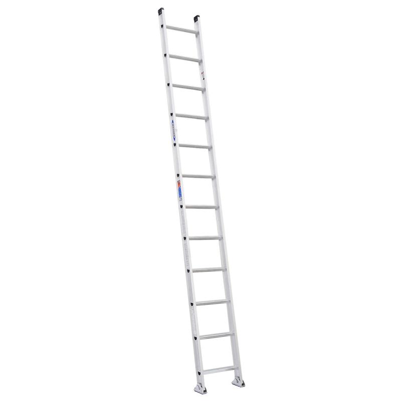 The D1500-1 series are one-section aluminum straight ladders with a duty rating of 300 pounds. The exclusive ALFLO rung joint means TWIST-PROOF performance every time. The side rails are extra heavy duty I-beam rails and the aluminum D Traction-Tred rungs are slip resistant. The rugged shoe rests flat or is held in spur position with the Shu-Lok feature for use on hard or penetrable surfaced