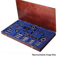 Champion 51 Piece 302 Carbon Taps & 327 Carbon Dies Set. 1/8 NPT pipe tap; taps/dies: 1/4-20, 1/4-28, 5/16-24, 3/8-16, 3/8-24. 7/16-14, 7/16-20, 1/2-13, 1/2-20, 9/16-12, 9/16-18, 5/8-11, 5/8-18, 3/4-10, 3/4-16, 7/8-9, 7/8-14, 1-8, 1-14. Accessories: 3305-1, 1-1/2 & 2 hex adaptor for round dies, 3002-2 "T" handle. 3291-1, 1-1/2 & 2 die stocks, 3001-7 bar handle tap wrench and screwdriver.