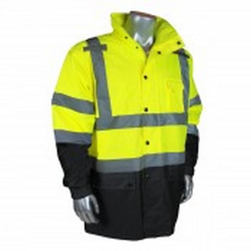HI-VIZ GREEN WITH BLACK BOTTOM; Radians RW30-3Z1Y is a Class 3, general purpose rain jacket with Reflectivz weatherproof and high visibility technology. The 300 Denier PU coated, high visibility oxford material provides excellent protection. The vented ba