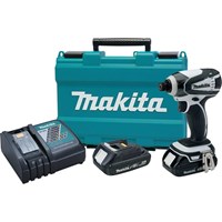 The Makita 18V Compact Lithium-Ion Cordless Impact Driver (model XDT04RW) delivers more torque with less weight and superior ergonomics, with a fast-charging battery for less downtime. It’s part of Makita’s expanding 18V Lithium-Ion series, the world’s largest cordless tool line-up powered by an 18V Lithium-Ion slide-style battery. The Makita 18V battery has the fastest charge time in its category, so the battery spends more time working and less time sitting on the charger. For improved tool performance and extended battery life, Makita created Star Protection Computer Controls™. Star Protection is communication technology that allows the Star Protection-equipped tool and battery to exchange data in real time and monitor conditions during use to protect against overloading, over-discharging and overheating. For increased versatility, the tool can also be powered by Makita 18V LXT® and Compact Lithium-Ion batteries with the star symbol on the battery indicating Star Protection inside. The XDT04RW features a Makita-built 4-pole motor with variable speed (0-2,300 RPM and 0-3,200 IPM). At only 5-7/16-inches long and 2.8 pounds, the XDT04RW has a compact and ergonomic design with less weight for reduced operator fatigue, and a rubberized soft grip for increased comfort on the job. The built-in L.E.D. light illuminates the job area for applications in dark spaces and close quarters.
