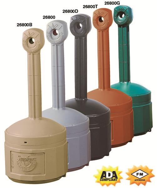 Utilizing Justrite's proven Cease-Fire technology, the Smokers Cease Fire innovative self-extinguishing design safely collects unsightly cigarette butts and reduces the risk of fire. Made of flame-retardant, sturdy polyethylene, this low maintenance smoker's friend won't rust, dent, or crack. Unique rain bonnet opening keeps rain out and discourages other trash. Simply lift off lid to empty big galvanized steel pail inside. Tie-down notches offer security and greater stability under severe weather conditions. In high humidity environments, unique "drip-lip" internal construction prevents tar condensation from escaping. Factory Mutual fire tested and approved!