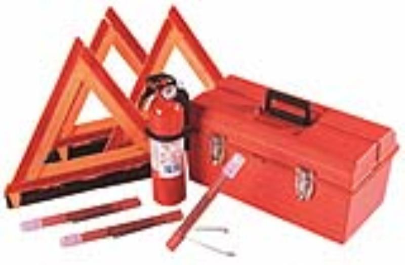 • This best-value custom safety kit contains the following: Three triangle warning flares, One 2-3/4lb. 10BC Fire extinguisher, Three 20-minute fusees with wire stand, and One heavy-duty plastic carrying case with handle.